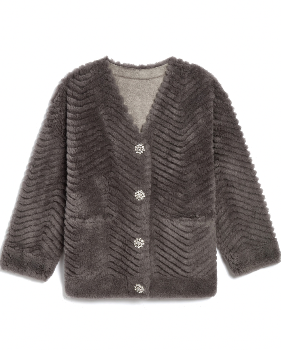 Brand New! Our new Sheared Sherpa Chevron Cardigan with Crystal Buttons is perfect for right now. This cardigan is almost like a light coat. Featuring our signature crystal snap buttons, it's perfect. Super soft and cozy. It's a piece that elevates your entire look. Very limited. Grab this one before it's gone.