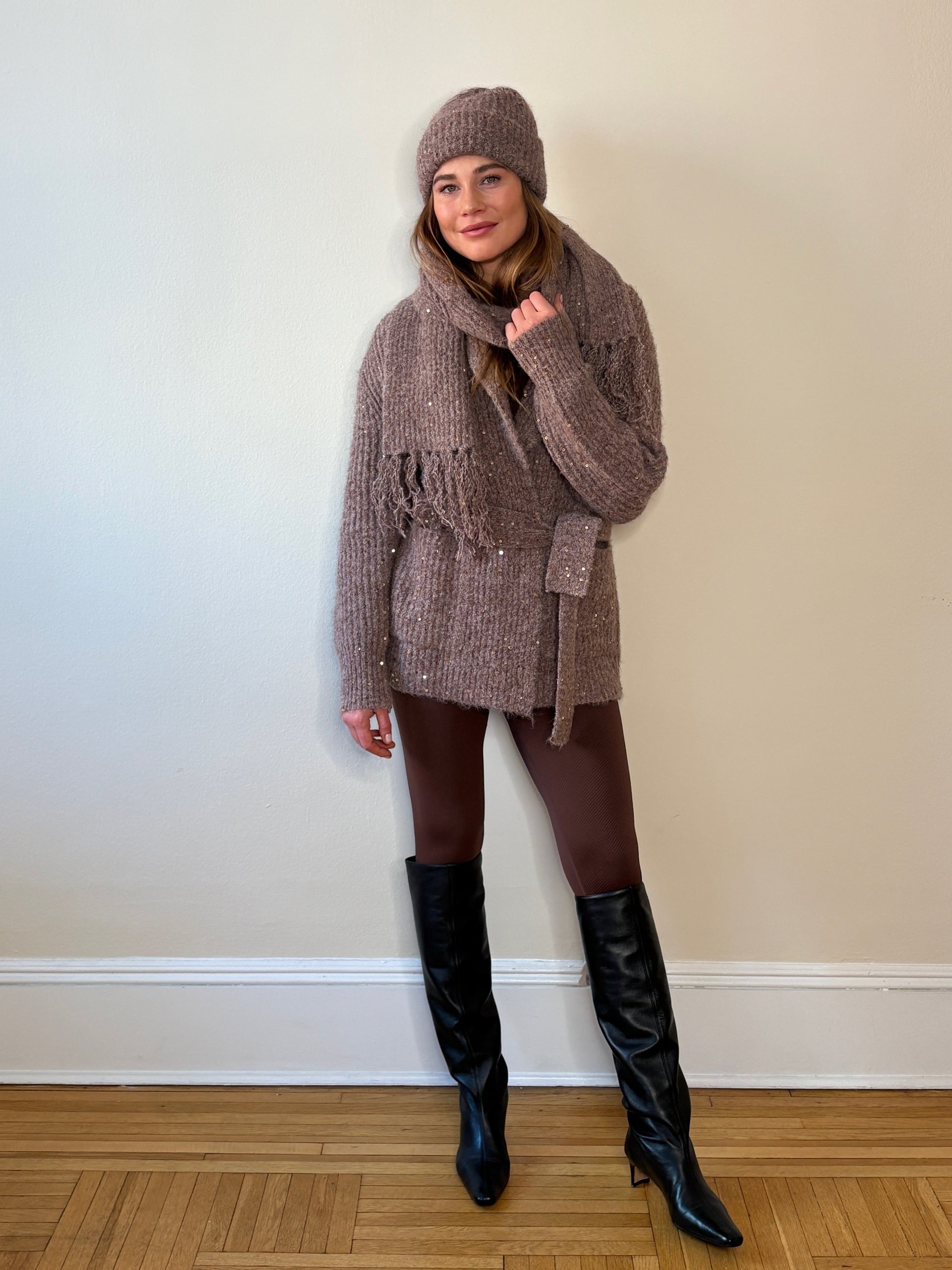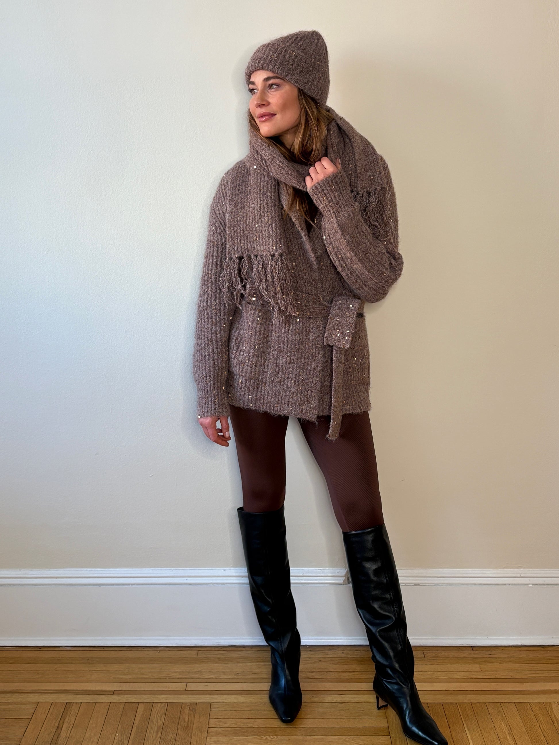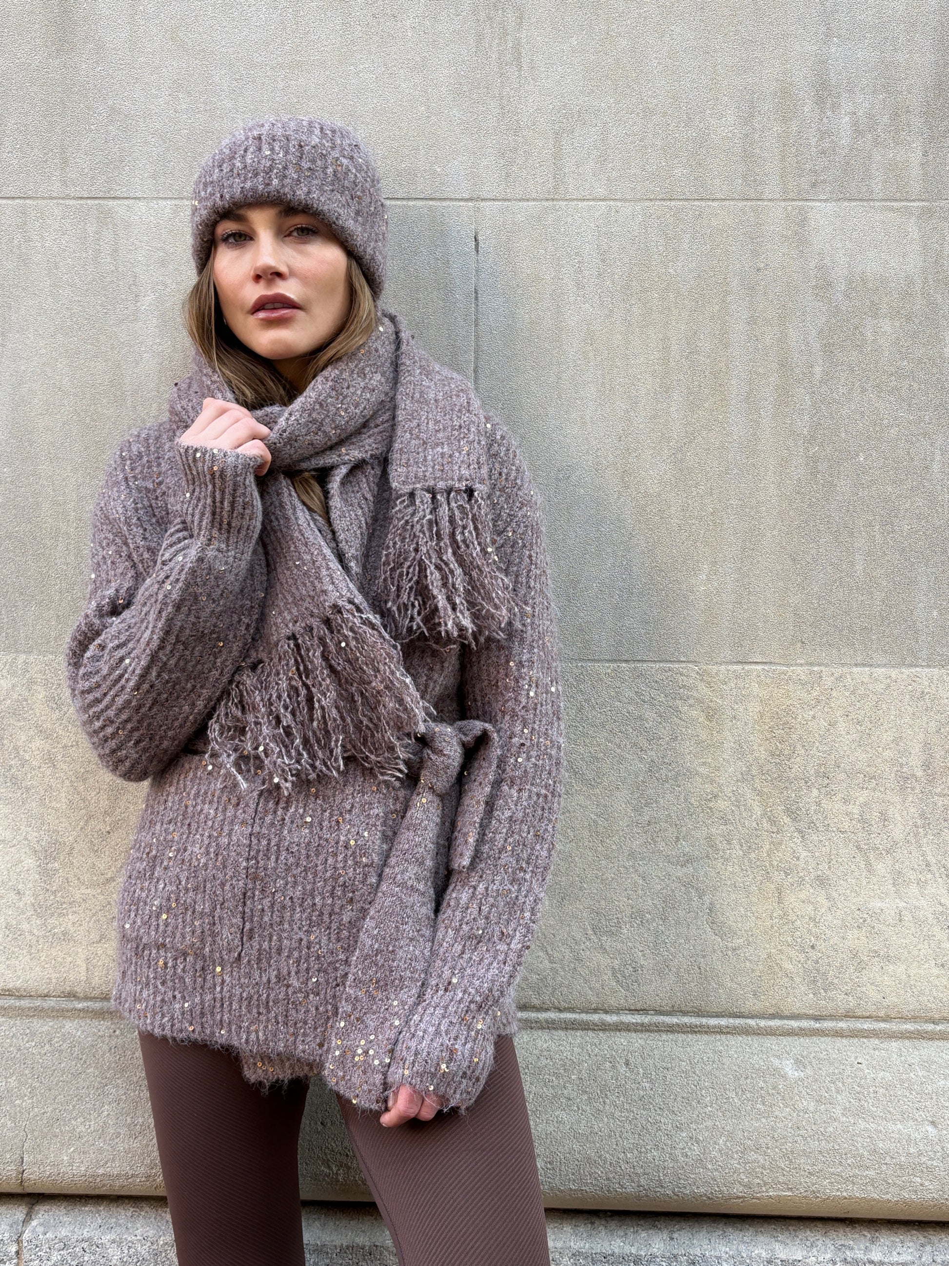 Our brand new Farrah cardigan is a soft Rib Knit Shawl Collar Belted Cardigan. Featuring a fleck of sequin. The sequins are subtle and chic and this Cardigan also pairs with the matching hat and scarf.