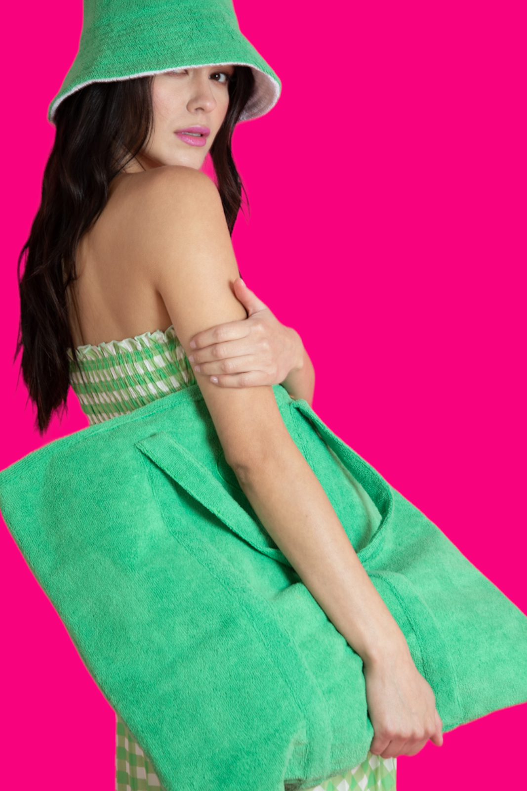 Only one left! The Mykonos Tote is our carry-all Terry cloth tote with imprinted heart and is perfect for running errands around town, beach days and everything in between. Pair with our matching Santorini bucket hat. Easily washes and dry at home.
