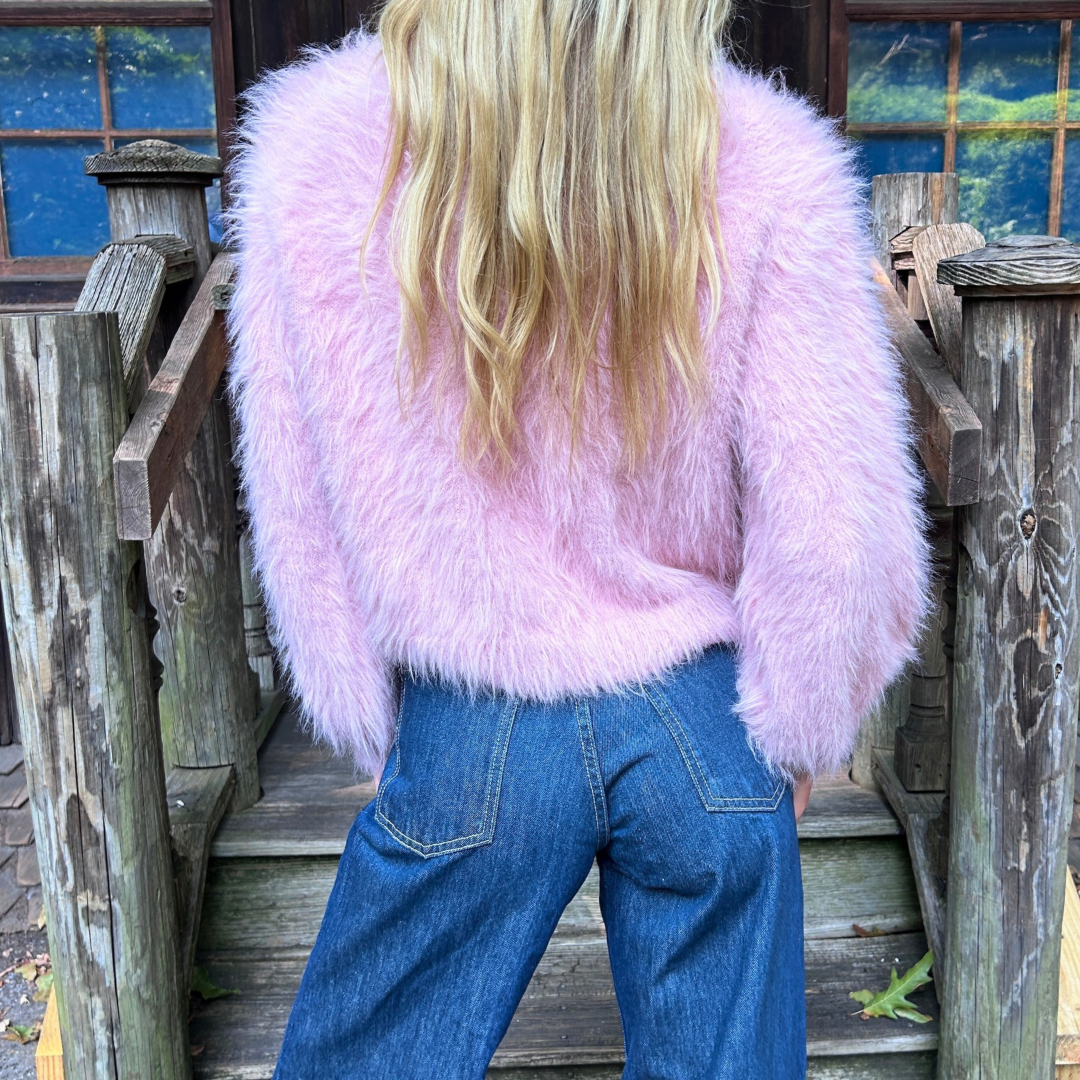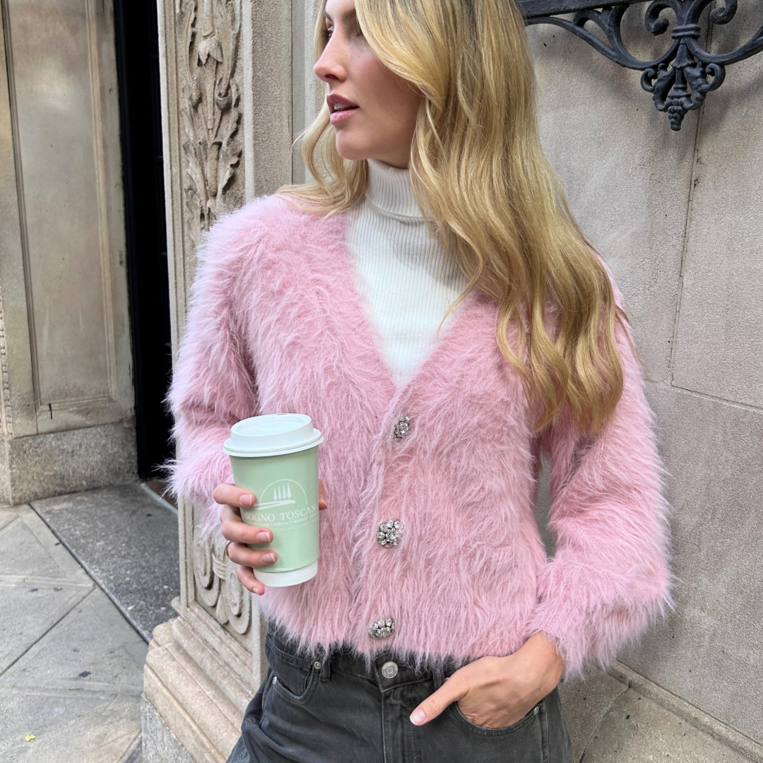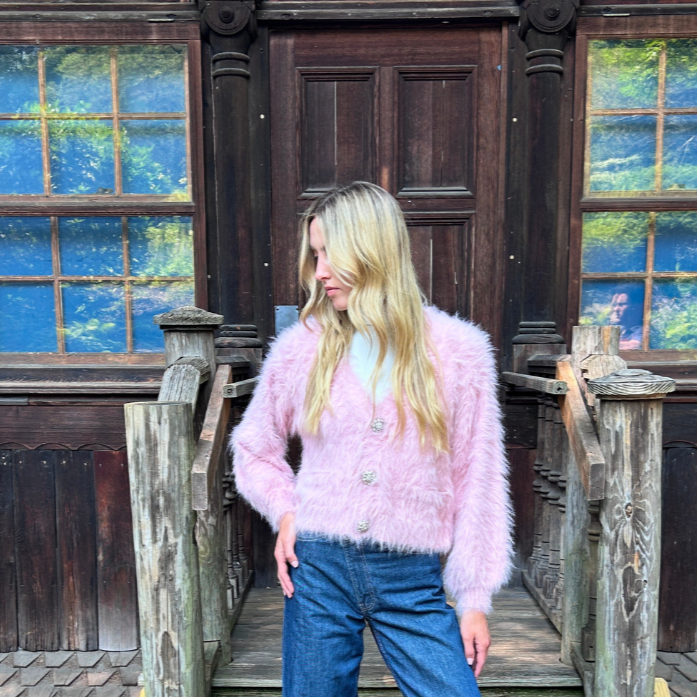 Isn't she Pretty in Pink? The Margaret Pink Fuzzy Cardigan is a beautiful soft light as a feather cardigan is just beyond perfect for spring. Wear this with a dress or with jeans. It's such a versatile piece to be worn day or night. The crystal buttons add that extra chic touch.