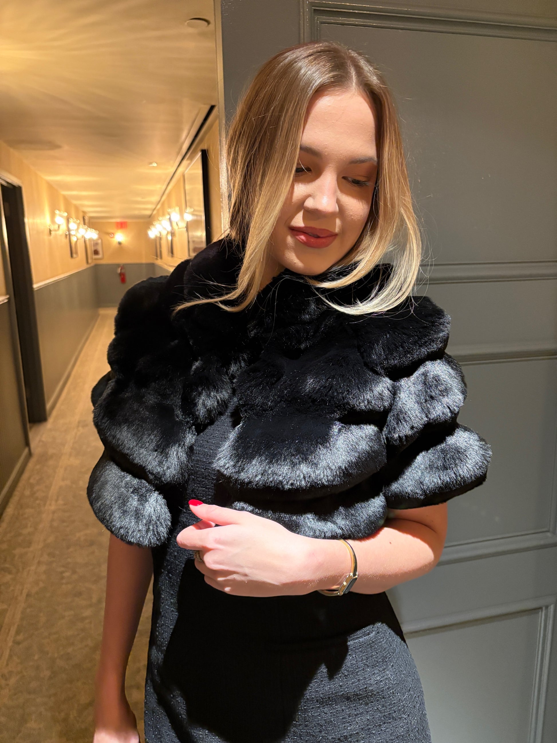 A new essential. With its discreet cropped silhouette and sculptural collar, our new short-sleeve Faux Fur bolero is your new cape coat for Fall/Winter. Throw it over a sleek dress for an elevated impact. Perfect for weddings and black tie events.