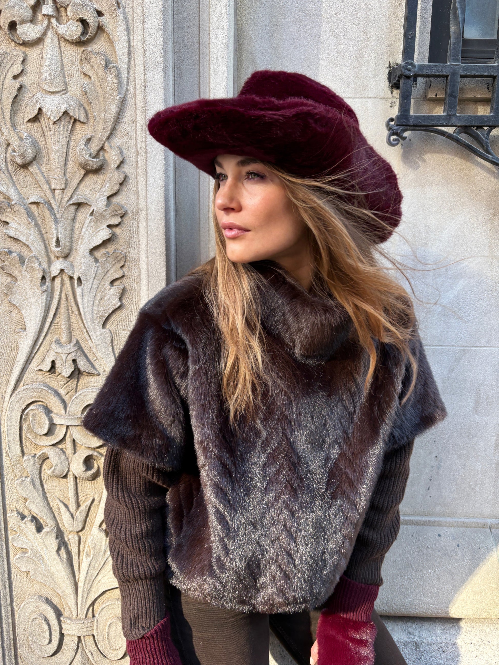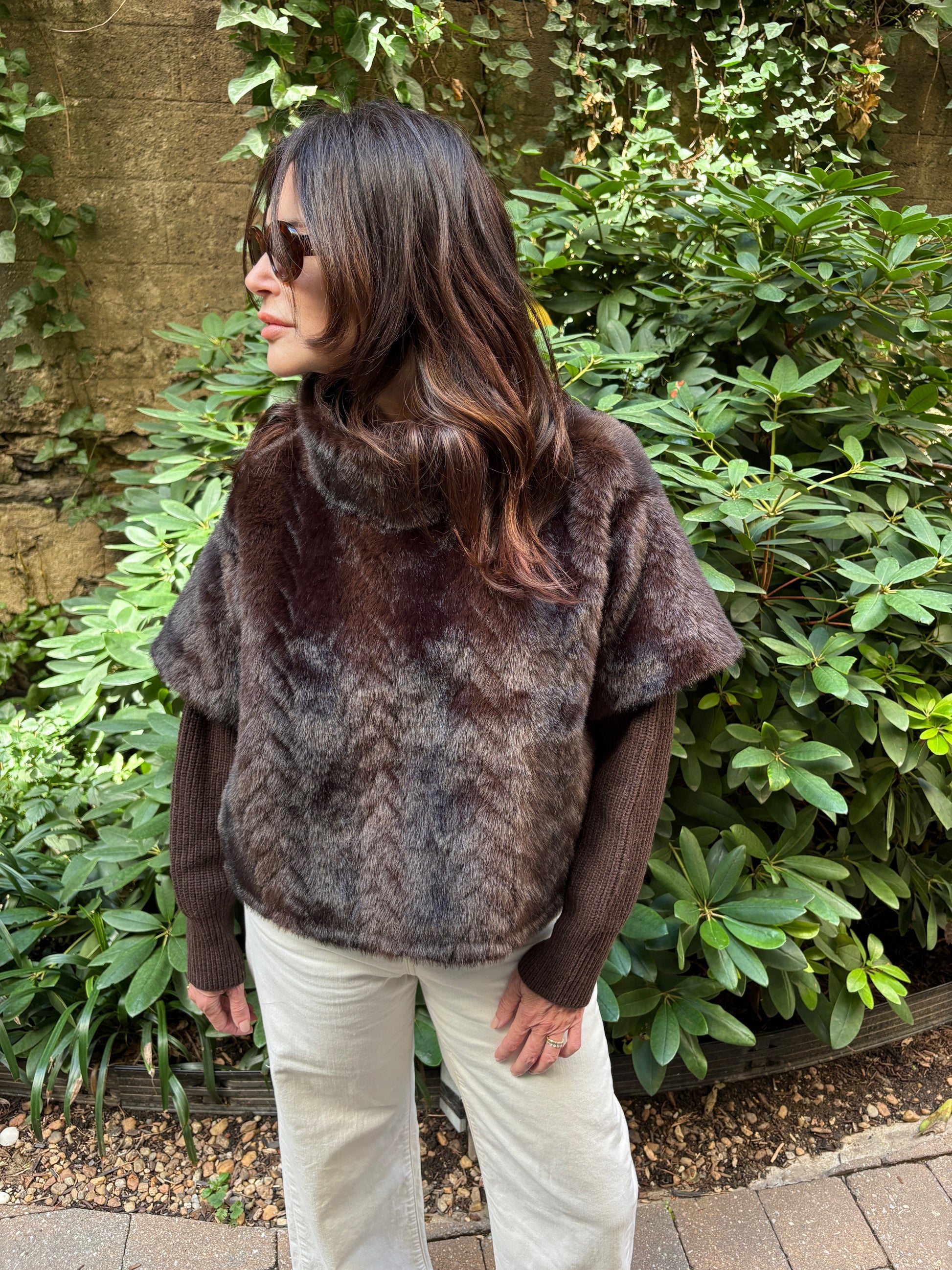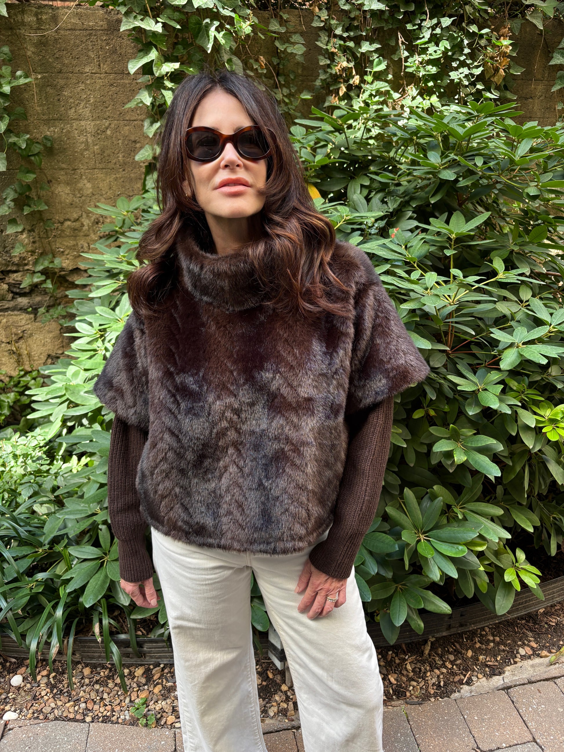 Sleek and sophisticated, this chocolate faux fur pullover sweatshirt is one of our standouts this season. Featuring a faux fur cable stitch with knitted sleeves this is a unique new piece from Jocelyn and spot on for Fall/winter.