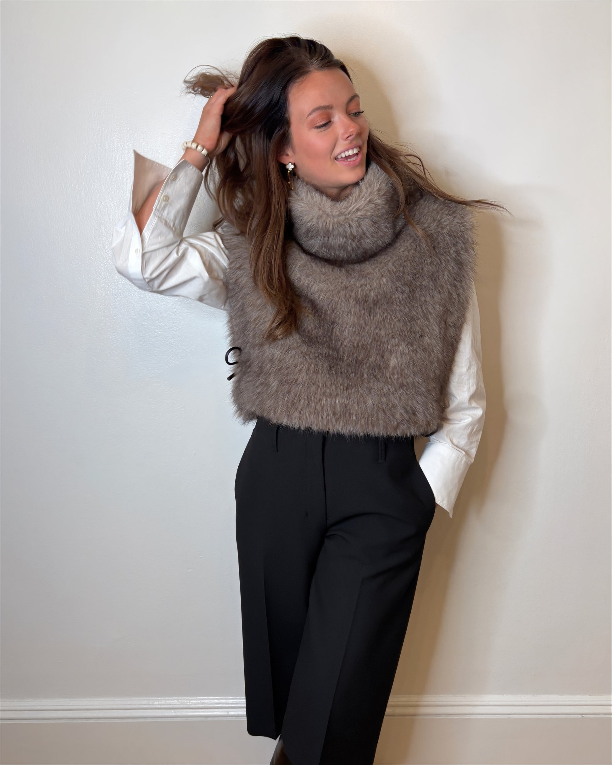 Brand new faux fur vest with side ties. Available in two color ways. Pair this with good jeans, pants, boots and your set for Fall.