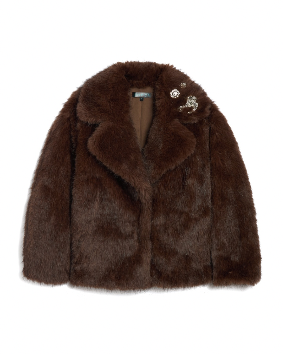 Mysterious, sophisticated and refined, this chocolate faux fur coat is a new classic. Featuring a beautiful Crystal-embellished clip adding just the right amount of intrigue, while its plush texture keeps you discreetly warm. A new essential coat from Jocelyn.